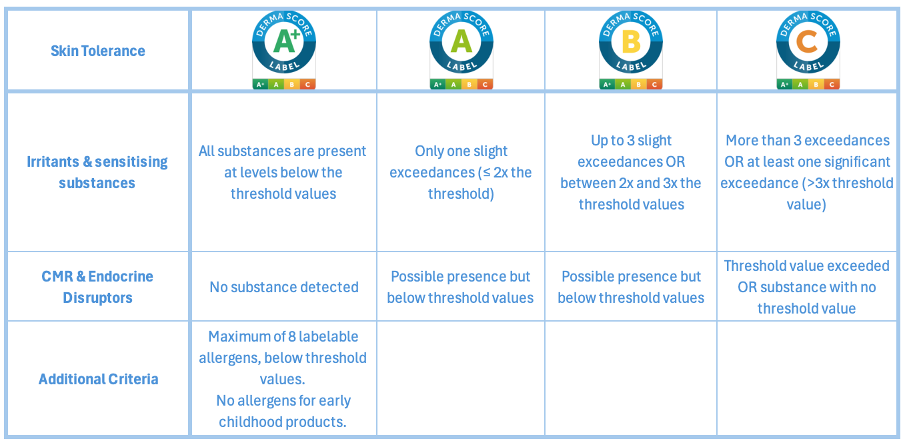 The Derma Score label (hereinafter “the Label”) provides consumers with a clear and independent indicator regarding the estimated skin tolerability of a product, based on a toxicological evaluation of its composition. It is based on an in-depth evaluation of the presence and potential impact of allergens, irritants, endocrine disruptors, and CMR substances (carcinogenic, mutagenic, reprotoxic). Each product is assigned a score ranging from A+ (highly tolerated) to C (lower tolerance), helping consumers make informed choice, particularly those with sensitive skin or seeking to avoid certain chemical risks.
